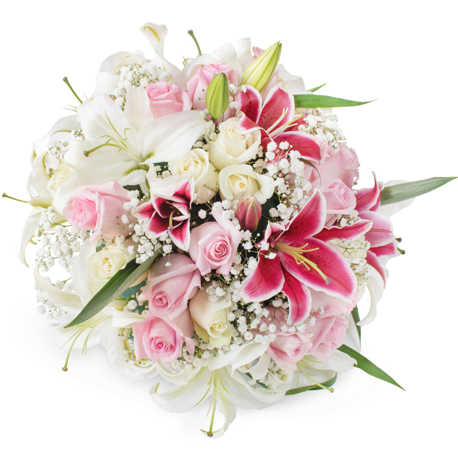 A classic selection of flowers including white and pink roses, white lilium and purple oriental lilium as well as gypsophila nestled into this traditional posy.