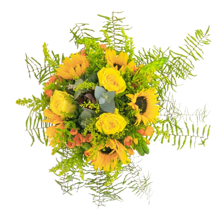 A luminous gathering of sunflowers and mixed blooms brings the spirited essence of summer in Nine Elms directly indoors. The bouquet's focal point-two radiant sunflowers-beckons the eye with broad, golden faces and rich chocolate centres, their positive energy filling the space like a bright day along the Thames Path. Surrounding them, clouds of dainty solidago and sunny mimosa intermingle with lively coral-orange blossoms, creating a joyful patchwork of colour. Sleek, dark green fern fronds spill from beneath, lending a touch of wild elegance, their textured lines echoing the hidden corners of local green spaces. Silver-blue eucalyptus sprigs provide a dash of urban chic, offset by fresh lime-green greenery that enlivens the composition. All are arranged thoughtfully in a transparent, bowl-shaped glass vase, showcasing the rooted structure and pristine water beneath. The bouquet's ambiance is vibrant yet soothing-a piece that could anchor a family table on Wandsworth Road or uplift a friend's day with a vibrant gesture. Each cascading stem and sunny bloom feels like a breath of fresh air from the heart of Nine Elms, perfect for birthdays, new beginnings, or simply bringing joy into your home. Glowing with the hues of a Nine Elms sunset, this stunning floral arrangement invites the senses on a journey through local colour and garden-inspired beauty. At its core, generous sunflowers stretch upward, their brilliant yellow petals broad and open around deep, velvety brown eyes-a nod to the optimistic spirit that enlivens the community near Vauxhall Pleasure Gardens. Warming the scene, sumptuous yellow roses, with their spiralled, buttery petals, cluster nearby, giving a gentle softness and a faint, uplifting fragrance. Accents of orange-red berries and tiny blooms add playful contrast, their colours echoing the vibrant diversity found at weekly local markets. Sprays of eucalyptus and dense, fresh greenery infuse the display with natural vitality, while delicate, feathery ferns splay outward like rays of light, completing the bouquet with a sense of airy openness. Every detail, from the plush textures to the subtle layering of foliage, evokes care and local craftsmanship-bringing cheer to celebrations or marking special days with heartfelt joy. Whether gracing a kitchen table on Nine Elms Lane or delivered as a thoughtful gesture to a friend nearby, this bouquet captures the promise of happiness, sunlight, and shared community moments in every carefully placed stem.