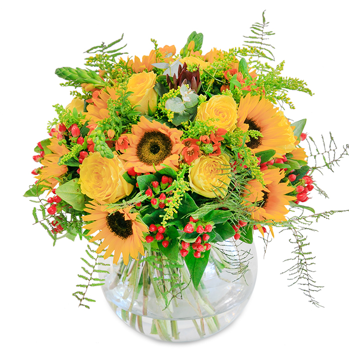 Radiating sunlit exuberance, this vibrant bouquet is thoughtfully arranged by a Nine Elms florist and offers a celebration of the season's brightest hues. Dominant sunflowers, their petals aglow in shades of deep gold and yellow, stand out like miniature suns, invoking joyful afternoons spent along the riverside walkways. At their side, buttery yellow roses unfurl in layers, each bloom meticulously curated to evoke classic garden charm. Crimson Hypericum berries nestle between the blossoms, their brilliant red orbs lending contrast and vibrancy, reminiscent of the lively produce at New Covent Garden Market. A lush gathering of greenery anchors the composition-the soft, feathery sweep of ferns, delicate sprigs of green filler speckled with dainty yellow blossoms, and slender flower spikes all blend harmoniously, creating movement and texture. Blue-green eucalyptus leaves peek out, adding a hint of aromatic freshness that recalls breezes flowing through local parks. The bouquet is set in a clear, round glass vase, its clarity emphasizing the structured tangle of fresh stems and water for a touch of urban elegance. As sunlight spills across the arrangement, it becomes a statement piece-perfectly suited for bringing warmth to a home, marking a milestone, or offering a heartfelt gift for friends and family in Nine Elms. Each element is selected with a florist's care, echoing the vibrancy and community spirit of the area.